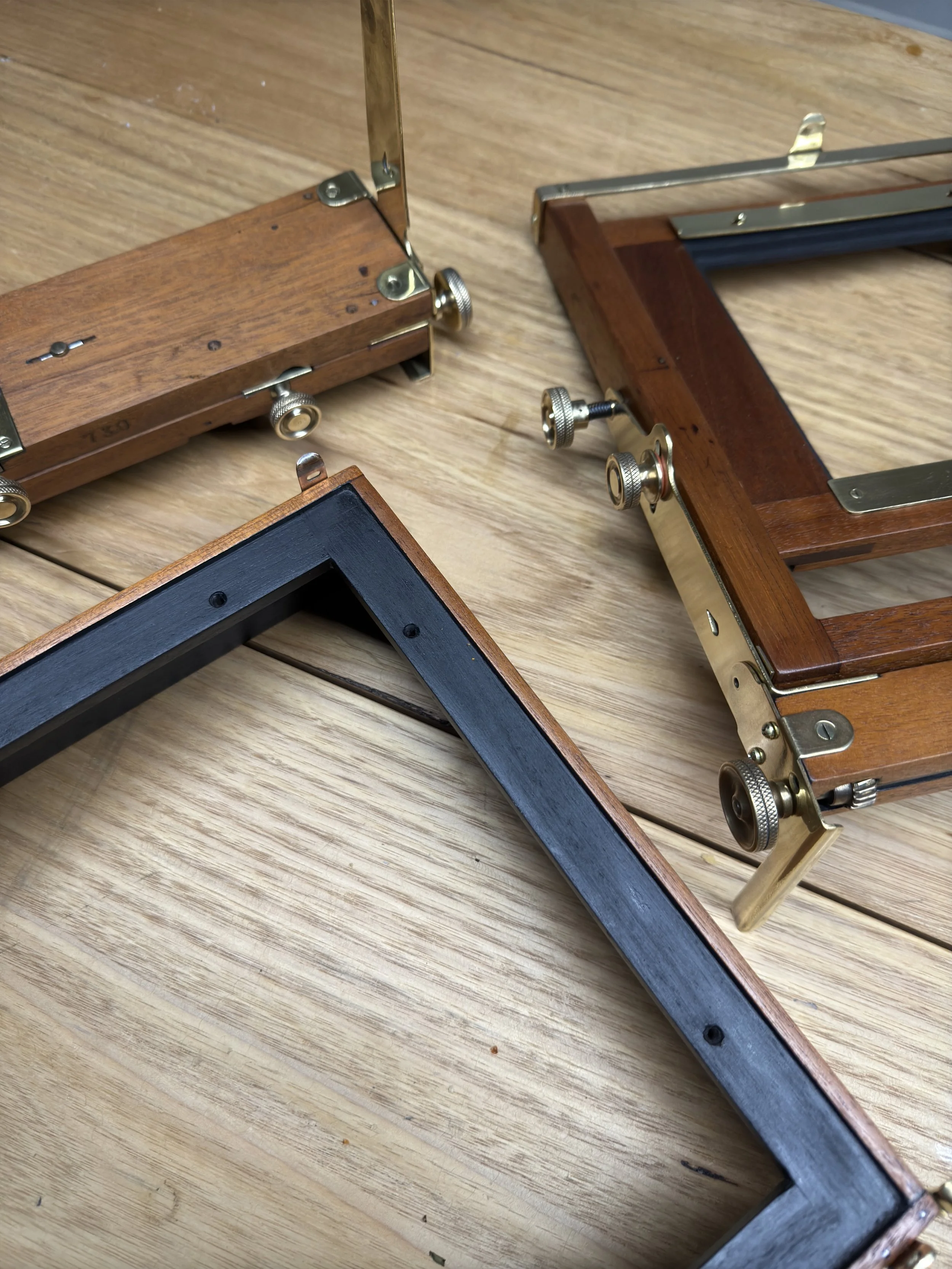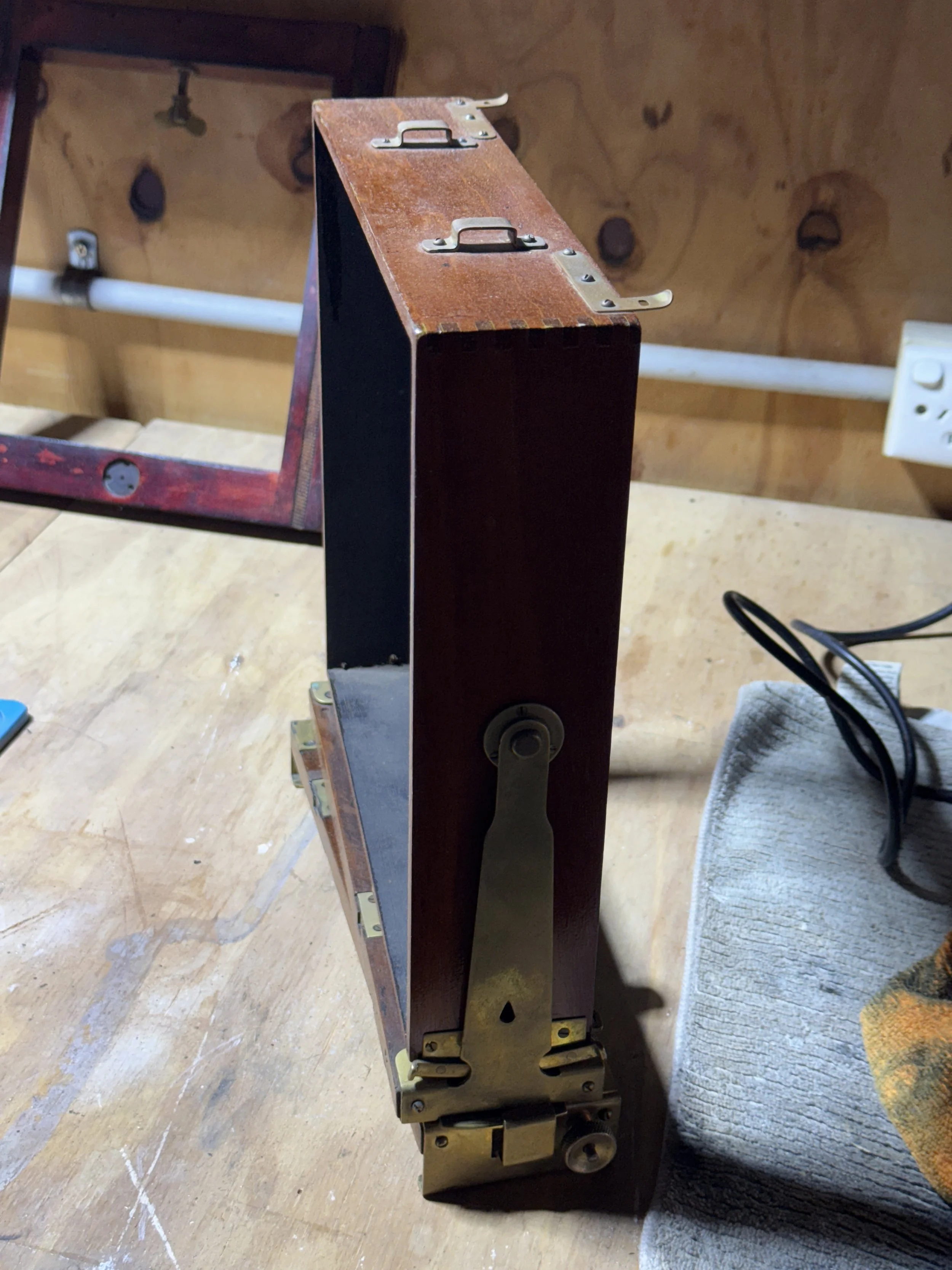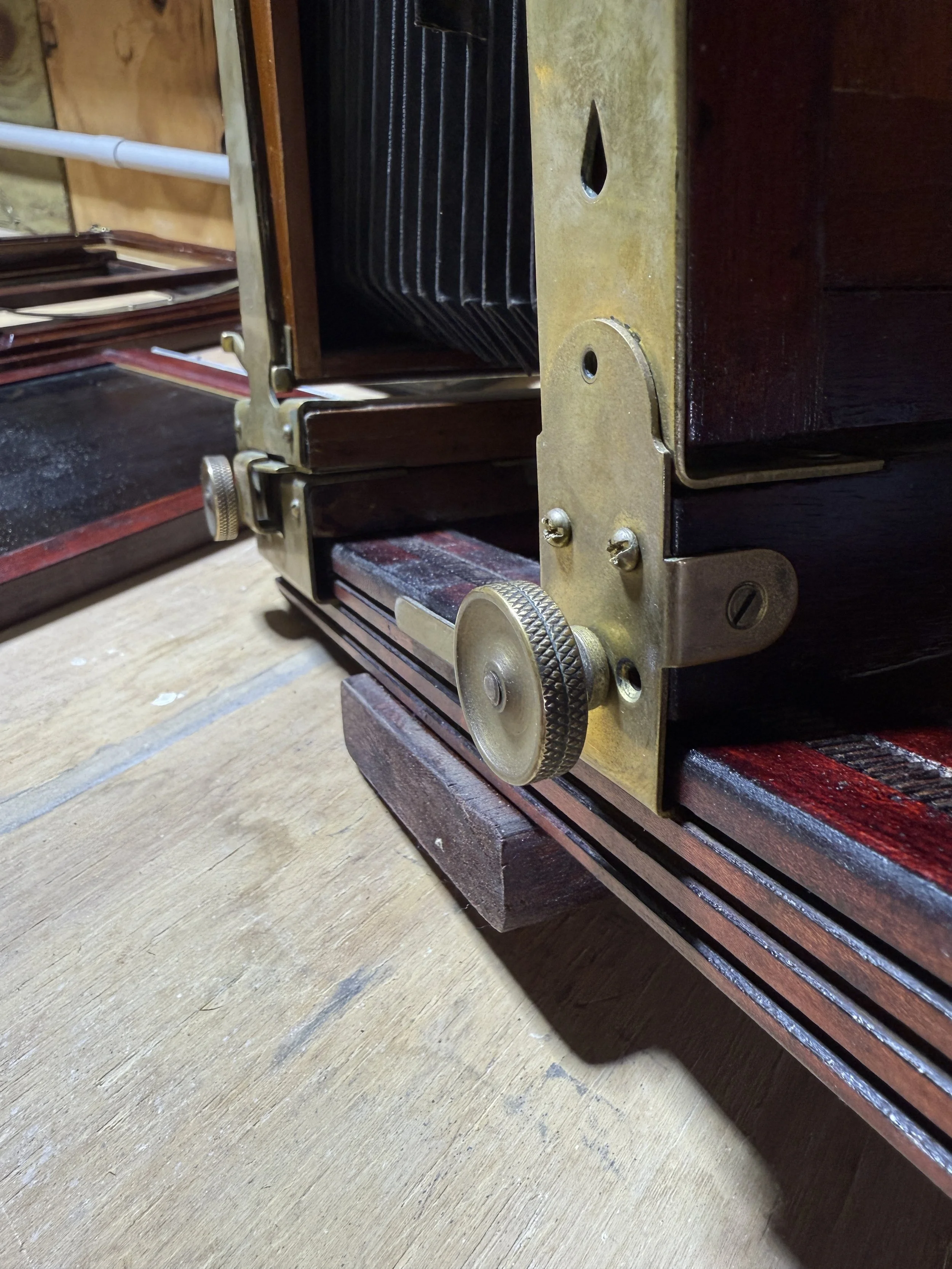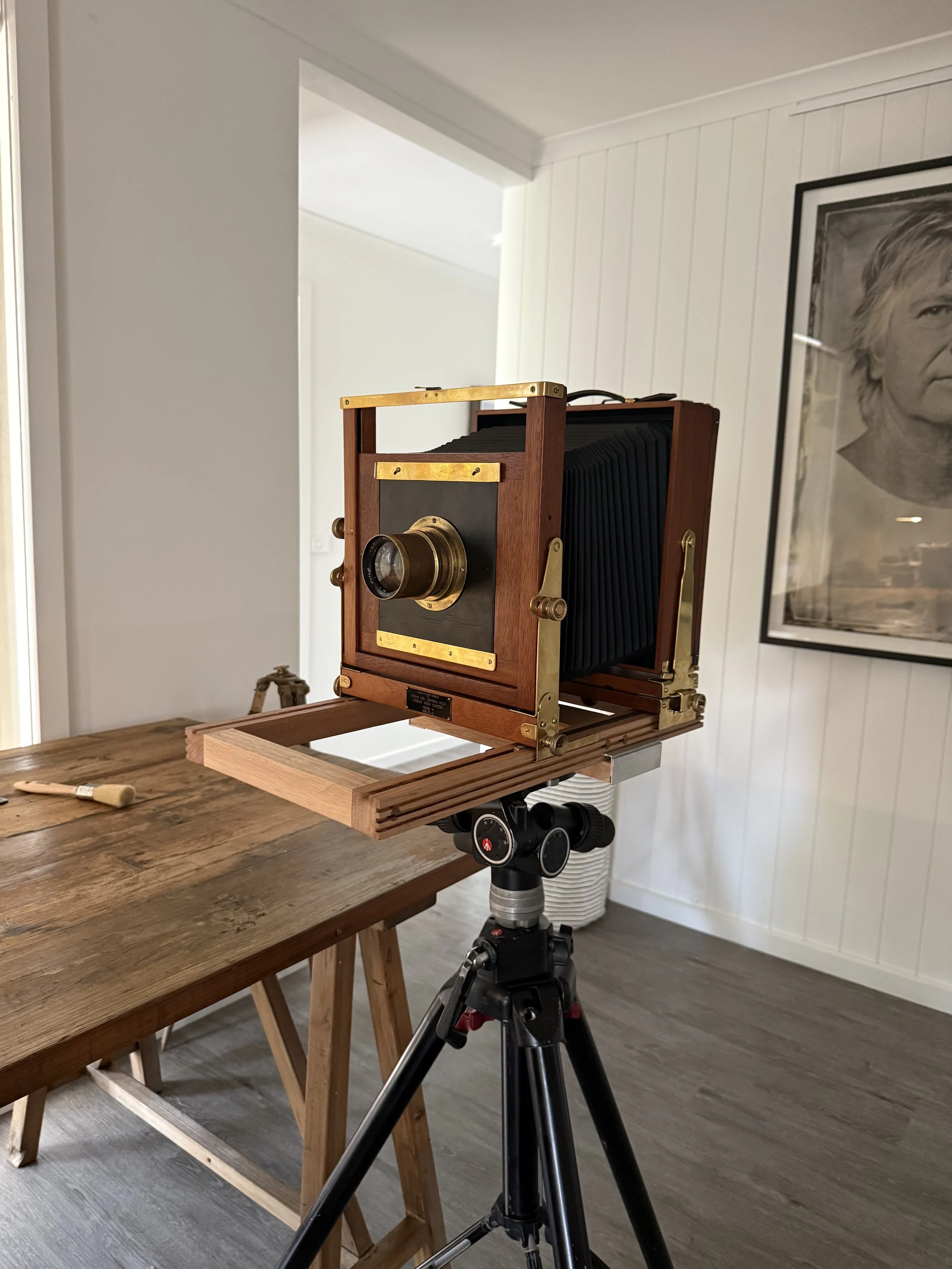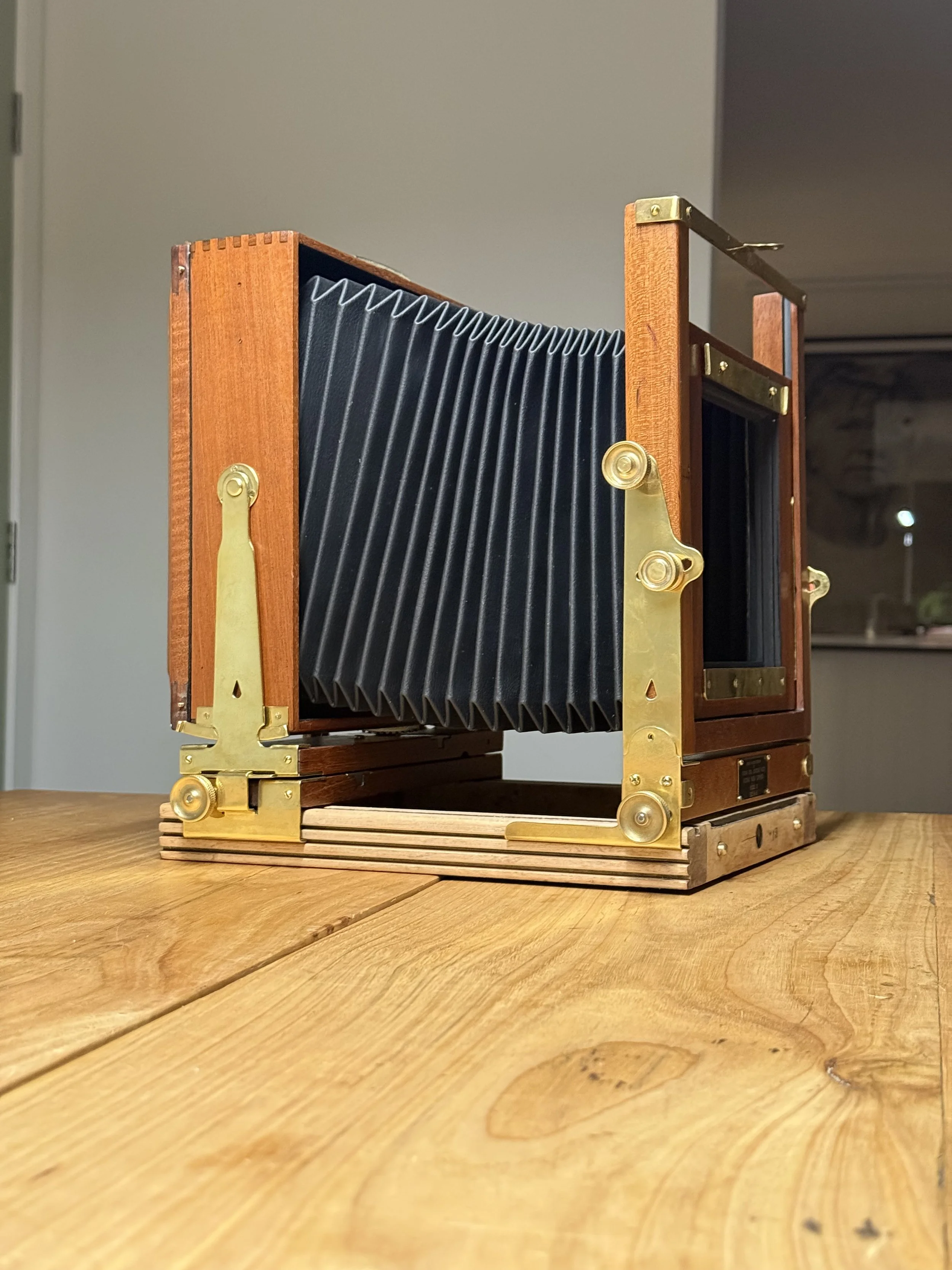 With no prior experience in restoration, I carefully documented every detail before dismantling it piece by piece. Brass fittings and screws were hand-polished, timber was sanded and waxed, and new rails were painstakingly rebuilt from Australian Blackwood. The rack was extended with the help of a 3D model designed by my son and printed by the team at Like Butter in Castlemaine. Recreating the bellows became a lesson in patience, precision, and respect for the ingenuity of the original makers. Even the ground glass and lens boards demanded trial, error, and invention.